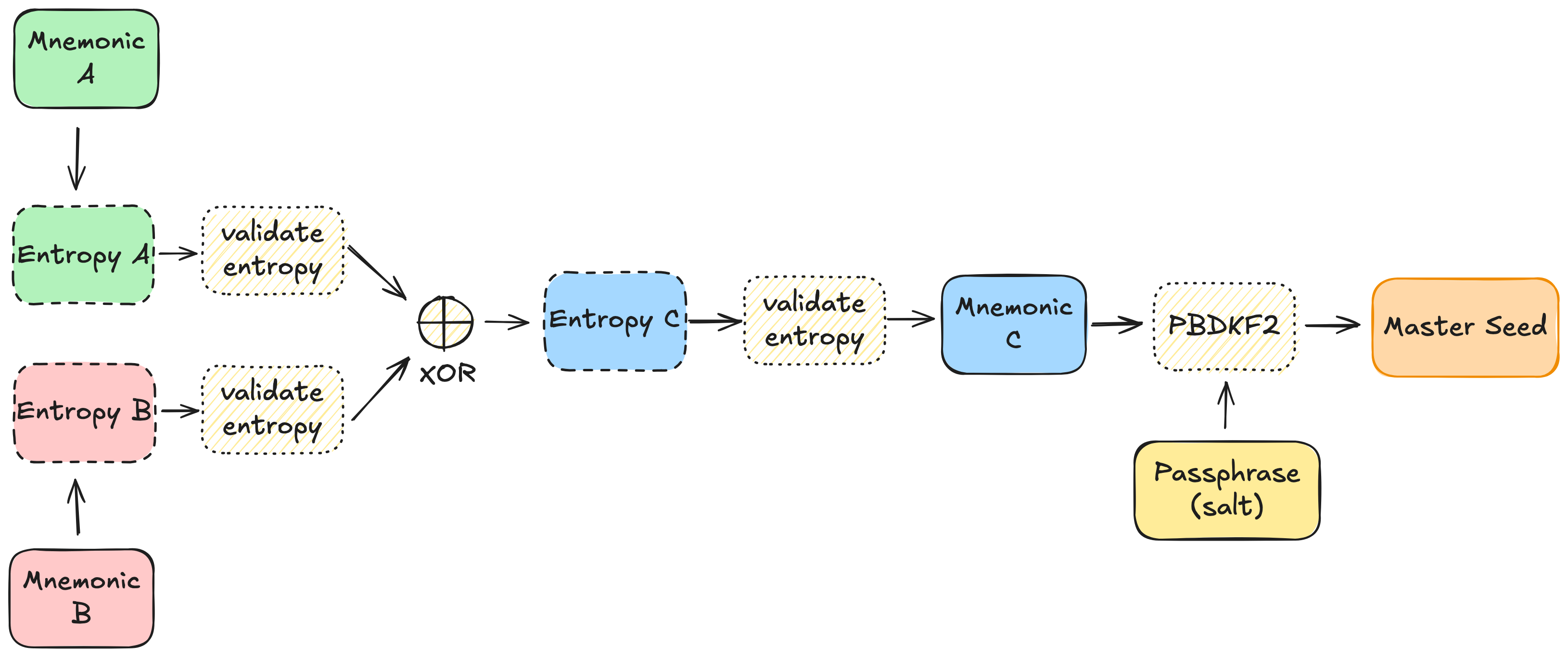 4. The resulting entropy from A XOR B will be used to generate the second share - mnemonic C.